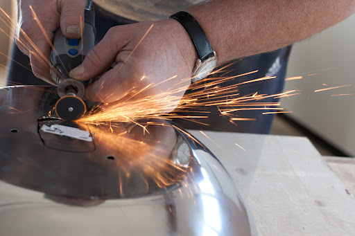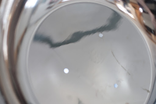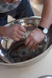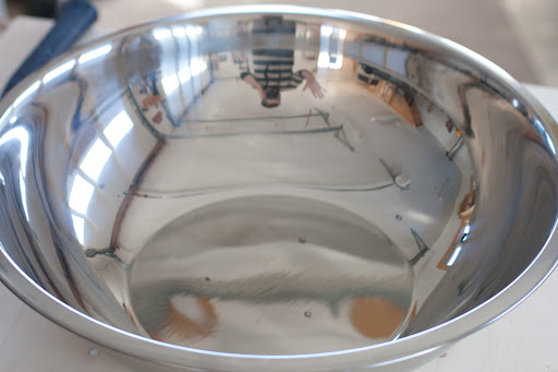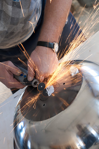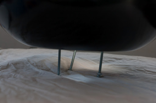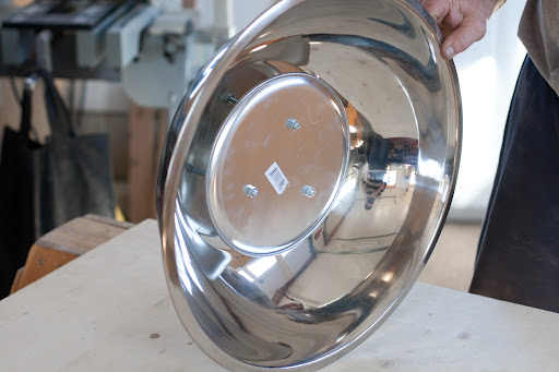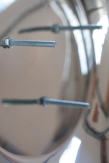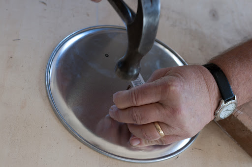 Using the bracket, we measured where they would go in the bowl, hammered the spots and drilled those holes.