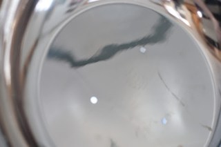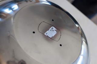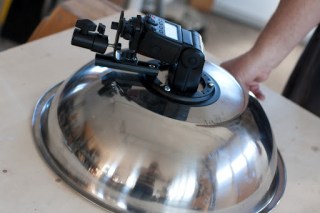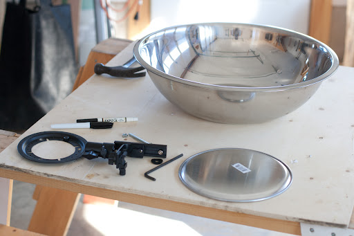 After the holes were drilled, we marked off a hole to cut out of the bottom of the dish that would fit the head of my flash.